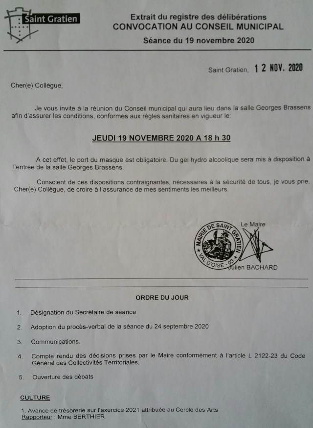 Prochain Conseil municipal de Saint Gratien ce jeudi 19 novembre 2020.