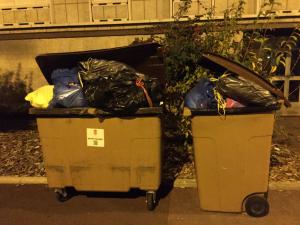 Nous constatons de façon récurrente que les containers à ordures sortis le mardi et vendredi rue Berthie Albrecht débordent sur le trottoir de façon importante, occasionnant nuisances visuelles, olfactives et potentiellement sanitaires. Il ne s’agit pas uniquement de cartons, mais également de sacs de déchets ménagers. Ce problème n’est pas récent, puisque nous le constations déjà au mois d’août, bien en amont du confinement. Il concerne d’ailleurs également d’autres endroits de collecte de déchets du Forum.
