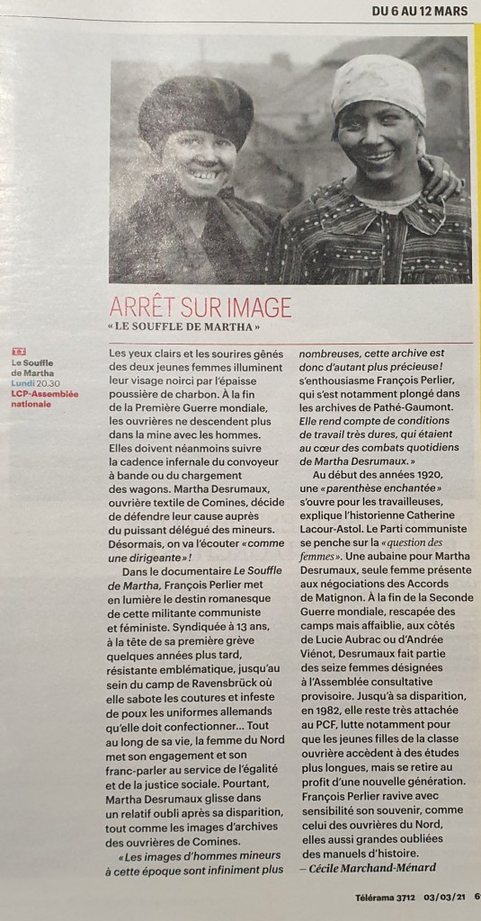 Une fois n’est pas coutume, la télé met à l’honneur ce 8 mars 2021 une femme oubliée et pourtant exceptionnelle, Martha Desrumeaux, ouvrière communiste.. et féministe !