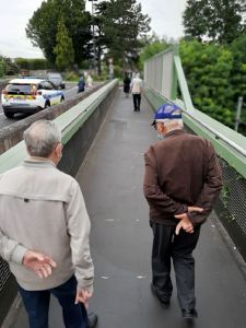 Avec un bémol : très rapidement les plus anciens des combattants présents n’arrivent pas à suivre le rythme. Ils le font savoir : « ça va trop vite !!! ». Fermant le cortège, nous nous retrouvons à côté d’eux, décrochés, y compris par la voiture de la police municipale, pourtant censée fermée le banc pour protéger le cortège. Aussi, c’est avec un souffle très court qu’ils apprécieront à peine les nouveaux panneaux Decaux du mobilier municipal, dont la nouvelle dimension est 50% inférieure aux précédents, et la nouvelle peinture des passages protégés en ville…