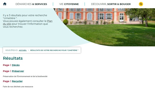Bien que récemment rénové, le site Internet de la ville est très incomplet et donne des réponses étonnantes, voir cette copie d’écran où la recherche « cimetière » renvoie à des rubriques « préserver la biodiversité » et « recycler nos déchets ».  Où trouver sur le site par exemple le moyen de joindre en cas d’urgence le service d’astreinte municipal en cas de problème urgent ? (quand par exemple l’armoire électrique de la résidence des Marais est grande ouverte sous la pluie le samedi après-midi 13/11 rue d’Ermont en direction de la gare d’Ermont/Eaubonne )