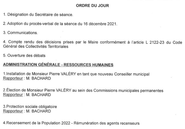 Le prochain Conseil municipal se tiendra le jeudi 17 février 2022, à 20h30 au gymnase du Forum.