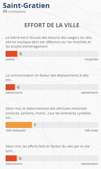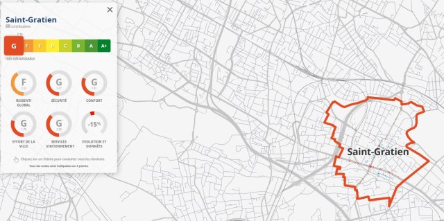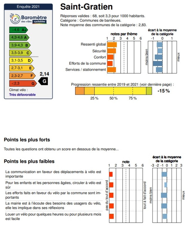 Au « baromètre des villes cyclables », Saint Gratien reçoit l’appréciation la plus mauvaise parmi les 8 possibles : très défavorable.