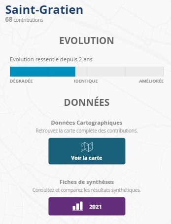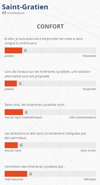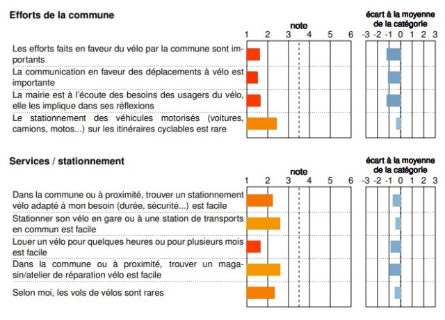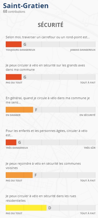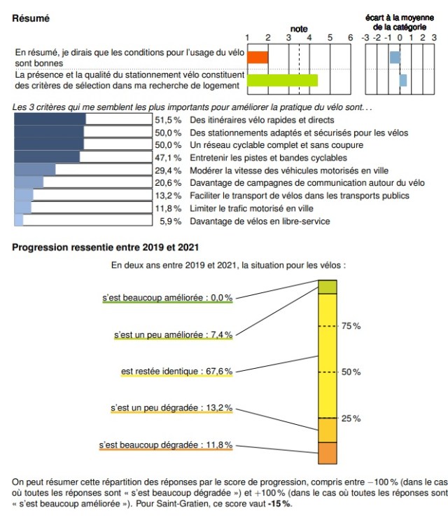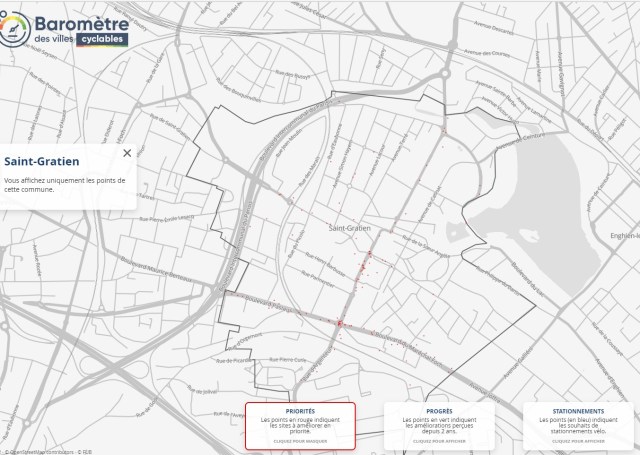 Les résultats du « baromètre vélo » en images ci-dessous, concernant Saint Gratien. Les points noirs et demandes fortes de la part des cyclistes montrent une attente d’itinéraires vélo rapides, sécurisés et sans coupures, et de stationnements adaptés. Les efforts de la ville en la matière sont sévèrement jugés. Sans surprise, les points à améliorer en priorité se situent sur les axes les plus importants : rue Berthie Albrecht, boulevard Foch/Pasteur, rue d’Ermont.