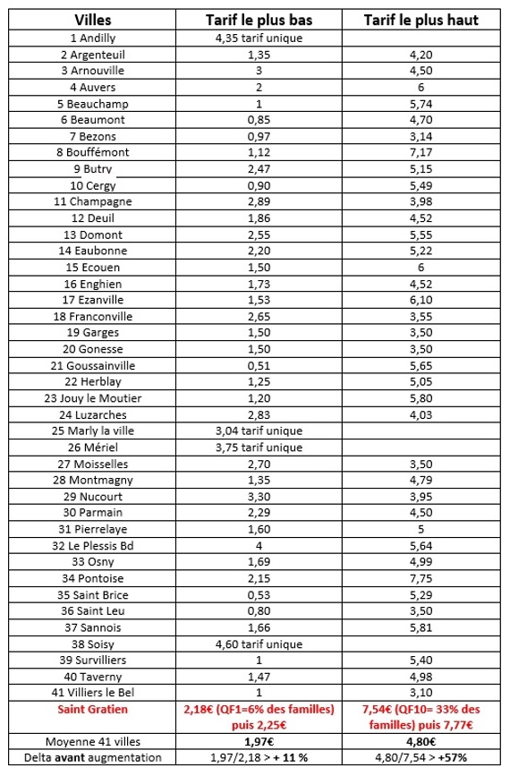 Nous avons comparé les tarifs gratiennois avec ceux de villes du Val d’Oise. Notre étude précédente portait sur 13 autres villes, nous en avons cette fois recensé 40, ce qui rend caduc le reproche de n’avoir choisi que des villes « particulières », soit de « gauche », soit avec cuisine centrale, soit de taille différente… Le panel est cette fois suffisant pour être significatif. Et le verdict sans appel.