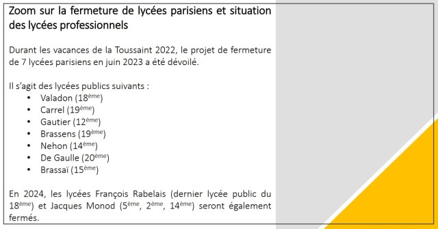 Le journal « Le Monde » le notait, il y a quelques jours : pas de vidéoprojecteurs ni d’écran roulant dans la salle de travail pour le lycée technologique de Bessières (17e arrondissement de Paris), qui a vu sa dotation globale de fonctionnement plonger à 156 263 euros, alors qu’elle était de 303 283 euros en 2022. Même constat au lycée Van Dongen, à Lagny-sur-Marne (Seine-et-Marne), dont le budget 2023 a été amputé de moitié. « Nous voulions changer deux fours qui sont déjà dysfonctionnels. S’ils tombent en panne, ce sera repas froid jusqu’à la fin de l’année », ironise Blandine Vidal-Naquet, élue du conseil d’administration.