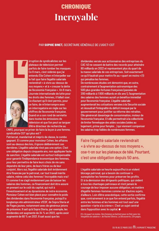 Les lecteurs et lectrices de « l’Humanité Magazine » la connaissent bien en revanche, puisqu’elle tient dans ce journal une chronique sur le monde du travail. À lire ou relire un échantillon de ses écrits ci-dessous.