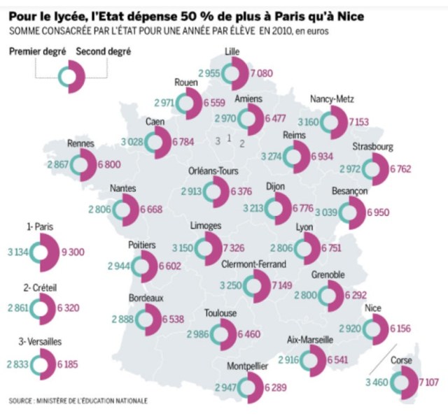 Un document de la Cour des comptes sur les inégalités à l’école montre que l’éducation nationale a dépensé 47 % de plus pour un lycéen parisien que pour un élève de l’académie de Créteil ou de l’académie de Versailles et 51 % de plus pour former un élève parisien qu’un élève niçois…