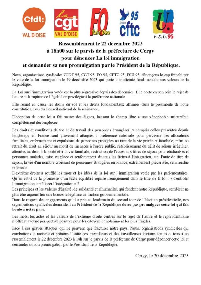 Parce que la loi immigration est contraire aux valeurs universalistes de la République, parce que « Liberté, égalité, fraternité », rendez-vous ce soir à Cergy pour manifester notre volonté de voir abroger ce texte inique.