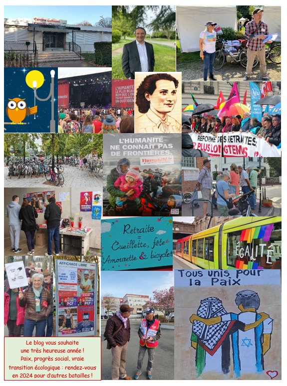 En ce tout début d’année, petit retour sur 2023 avec quelques images, toutes parues sur le blog : vente du muguet du 1er mai, activité municipale, incendie du centre  Camille Claudel, manifestations pour une autre réforme des retraites, élection d’un sénateur apparenté PCF, rencontres locales au marché, actions pour le développement des transports doux ou l’extinction de l’éclairage public, 80è anniversaire de la mort de Danielle Casanova en déportation, fête de l’Humanité, guerre à Gaza… tous ces sujets ont fait ici l’objet d’articles.