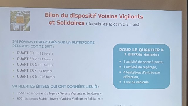 C’est bien peu pour lancer les échanges, et je m’interroge sur le faible investissement dans cette partie de la ville. Difficile de tirer un quelconque enseignement sur l’efficacité de « Voisins Vigilants et Solidaires». Les « alertes » émises ont-elles permis d’empêcher le passage à l’acte ? À quoi ont pu servir les « échanges entre foyers VVS » ou les « échanges entre les VVS et la mairie » ? Impossible de tirer une conclusion sur la pertinence de ce dispositif, sur lequel j’ai émis un avis dubitatif dès sa mise en œuvre.