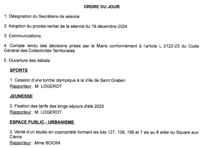 Conseil municipal de Saint Gratien le jeudi 13 février 2025. Voici l’ordre du jour.