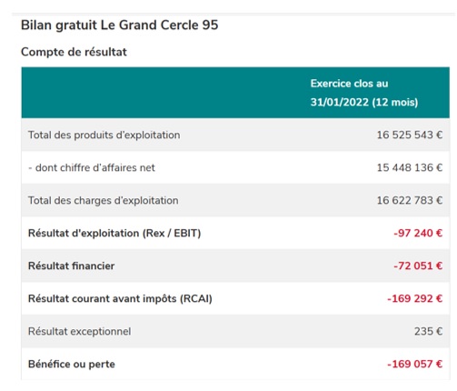 Selon les comptes arrêtés à fin janvier 2024, le groupe « Le Grand Cercle » a réalisé 15,7 M€ de chiffres d’affaires, pour des pertes de 1,2 M€.