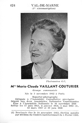 Le PCF n’œuvre donc pas seulement à « ouvriériser » les assemblées électives françaises. Il est aussi, à partir de la Libération, le principal acteur de leur féminisation. Odette Roux, une institutrice qui a rejoint le parti dans la clandestinité en janvier 1941, résistante avec son mari (mort dans une prison allemande), est élue maire des Sables-d’Olonne en mai 1945. À 28 ans, elle devient la première femme à la tête d’une sous-préfecture. En octobre de la même année, dix-sept des trente-trois premières femmes élues députées sont communistes. En 1956, il n’y a plus que dix-neuf femmes à l’Assemblée nationale, mais quinze sont communistes. Parmi elles, Eugénie Duvernois, infirmière, ancienne résistante et déportée (son mari est mort à Mauthausen), élue de Seine-et-Oise.