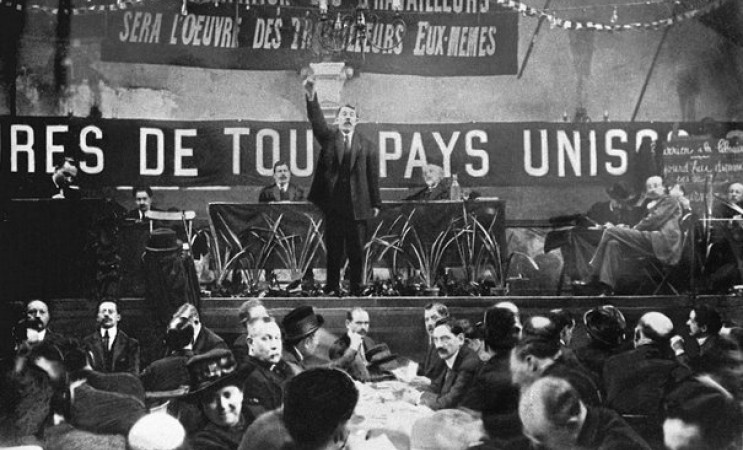 Derrière la tribune, une grande banderole reprend la formule de Karl Marx et Friedrich Engels : « Prolétaires de tous les pays, unissez-vous ! » Elle est surmontée d’une bannière arborant le slogan de la Ire internationale : « L’émancipation des travailleurs sera l’œuvre des travailleurs eux-mêmes ». En ce 25 décembre 1920 s’ouvre à Tours le 18e congrès de la Section française de l’Internationale ouvrière (SFIO), à l’issue duquel une très large majorité des délégués du Parti socialiste (70 % des mandats) décident d’adhérer à l’Internationale communiste (IC). Cette dernière, également dénommée IIIe Internationale, a été créée l’année précédente, en mars 1919, sous l’impulsion de Lénine et des bolcheviks russes dans l’espoir d’étendre leur révolution au monde entier.