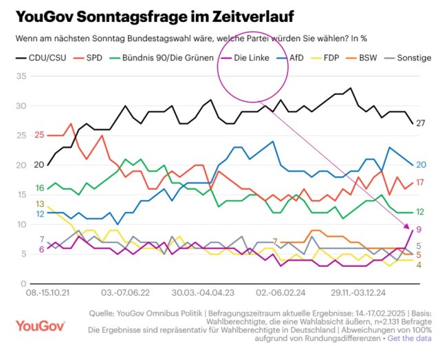 Outre un gain médiatique immédiat, cet épisode a aussi permis à Die Linke de marquer sa différence avec son ancienne leader, la très controversée Sahra Wagenknecht. L’élue a claqué la porte du parti en 2023 pour fonder sa propre formation politique « BSW » sur son nom propre (Bündnis SahraWagenknecht) en entraînant avec elle « de nombreux militants très actifs ». Mais cette dernière, qui se présente elle aussi aux législatives, dévisse dans les enquêtes d’opinion pour avoir prôné une « ligne dure » sur l’immigration, semblant s’aligner sur l’AfD sur ce sujet.
