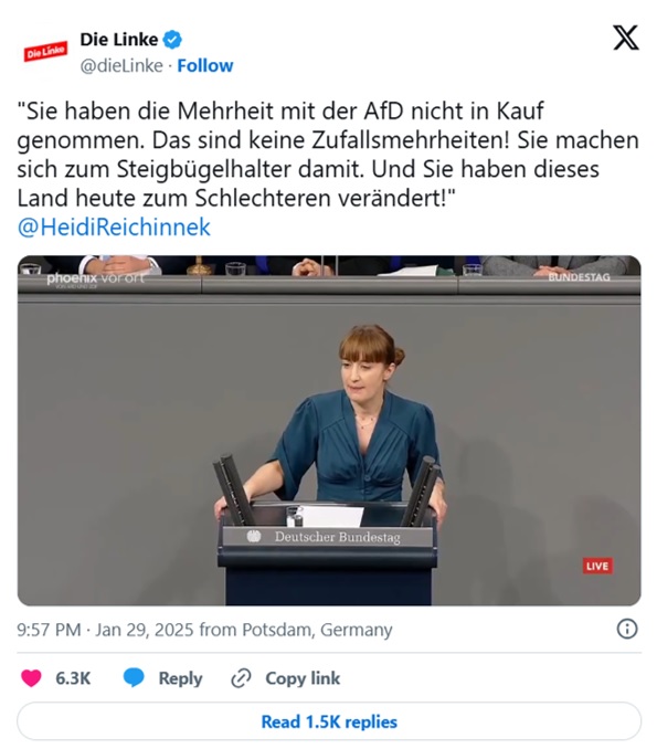 La charge de Heidi Reichinnek, qui pointe le rapprochement entre la CDU et l’AfD a fait date : Die Linke est maintenant à 9% dans les derniers sondages et engrange plein de nouveaux adhérent·es…