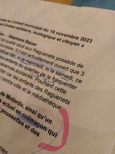 PV de la séance précédente de septembre 2023 : bien que le document retrace, pour une fois, assez fidèlement les échanges de ce soir-là, il ne mentionne pas le fait que le maire m’ait refusé la parole alors que je demandais à intervenir sur le dossier Effia. Une pratique bien peu acceptable que le maire ne souhaite visiblement pas qu’elle apparaisse clairement dans un PV, ce n’est pas très étonnant ! Pour rappel, nous demandions des informations précises sur le nouveau contrat passé avec Effia pour le stationnement payant, à la suite de la calamiteuse gestion de la concession confiée à Indigo durant sept ans.