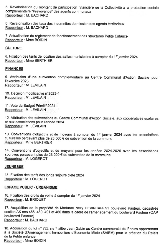 Dernier Conseil municipal de 2023 ce jeudi 21 décembre. En voici l’ordre du jour, assez chargé. La séance est publique et s’ouvre à 20h30, en salle des mariages.