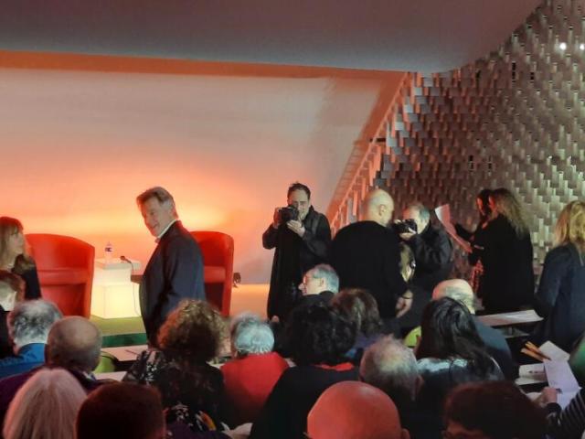 Ci-dessous, Natacha Polony, Julie Gayet, Fabien Roussel, Richard Melka, pour une soirée-hommage à Charlie le 8 janvier 2025, au siège parisien du PCF
