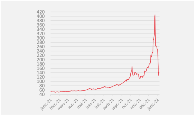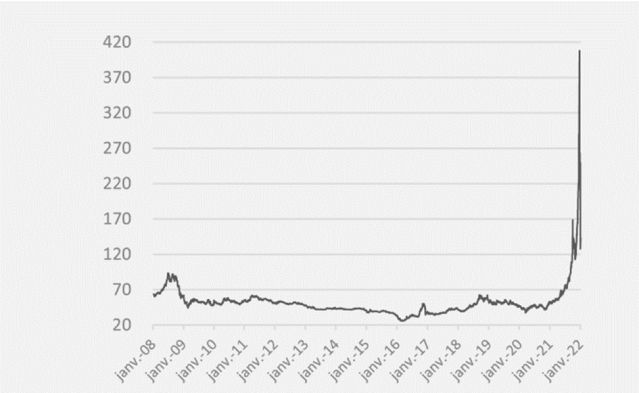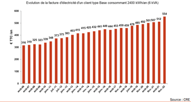 Pour ce faire, la CRE a élaboré une formule reflétant les coûts d’approvisionnement non pas d’EDF, mais d’un fournisseur alternatif moyen. Elle a donc introduit dans la composante « fourniture » une part reflétant les prix du marché de gros. C’est cette part qui a explosé au cours des derniers mois en raison de la crise des prix du gaz (et de l’indisponibilité du nucléaire en France) conduisant les tarifs règlementés à augmenter de près de 45 % !